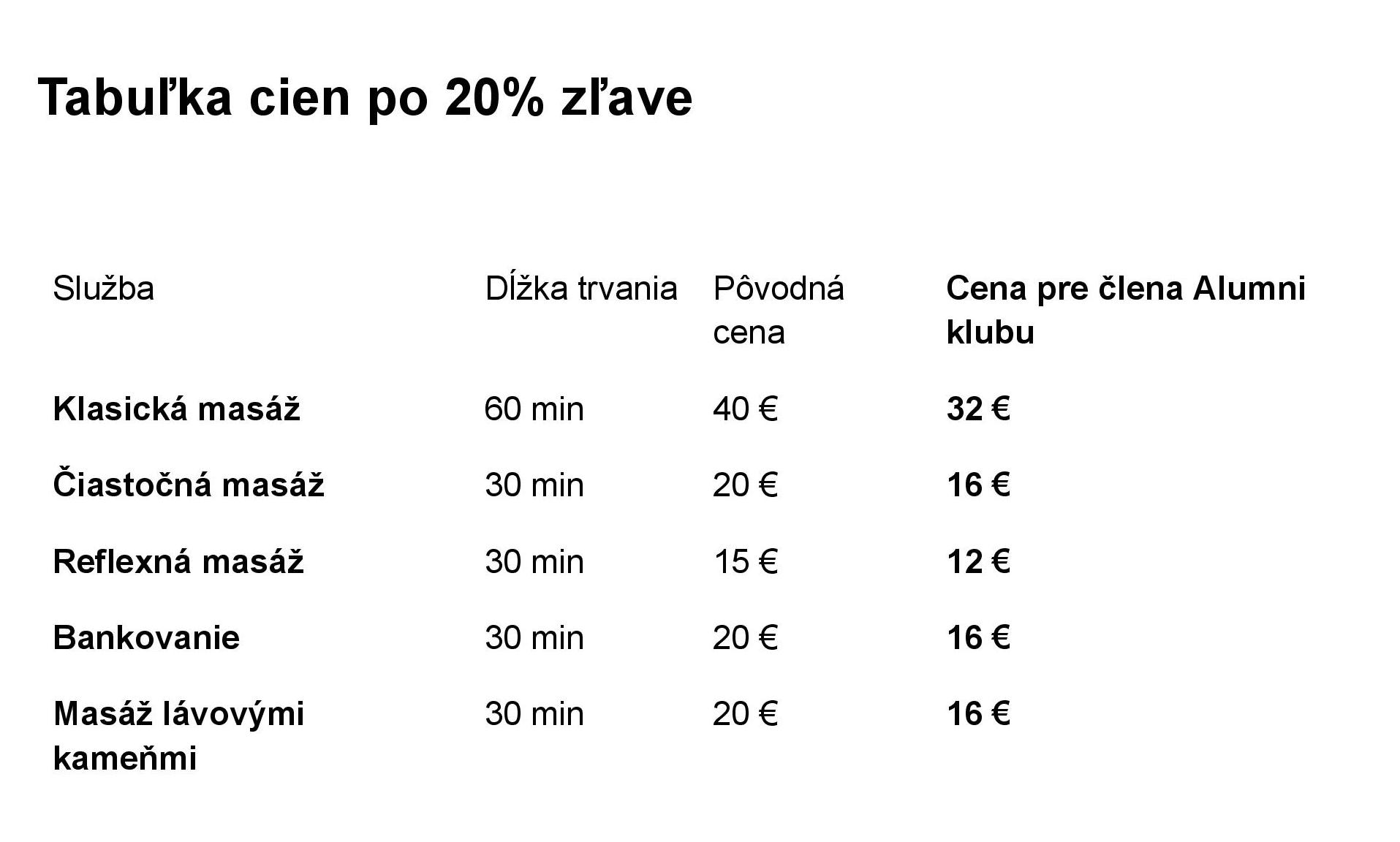 Vychutnajte si relaxačné masáže za akciovú cenu, ktorá je pre členov ALUMNI KLUBU Gréckokatolíckej teologickej fakulty PU vo výške -20%. Na uplatnenie zľavy je potrebné, aby sa členovia klubu preukázali členskou kartou klubu.